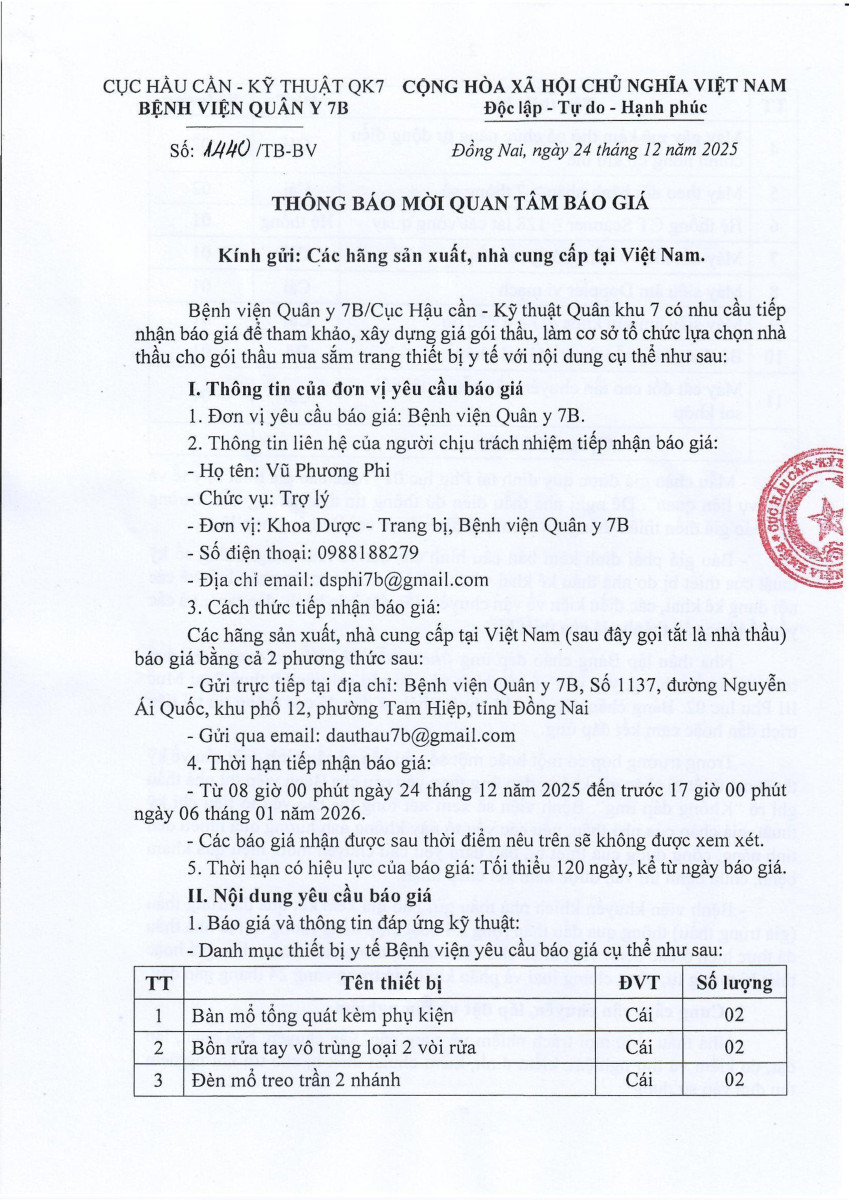 BỆNH VIỆN QUÂN Y 7B BIÊN HÒA ĐỒNG NAI - CỤC HẬU CẦN - KỸ THUẬT QUÂN KHU 7