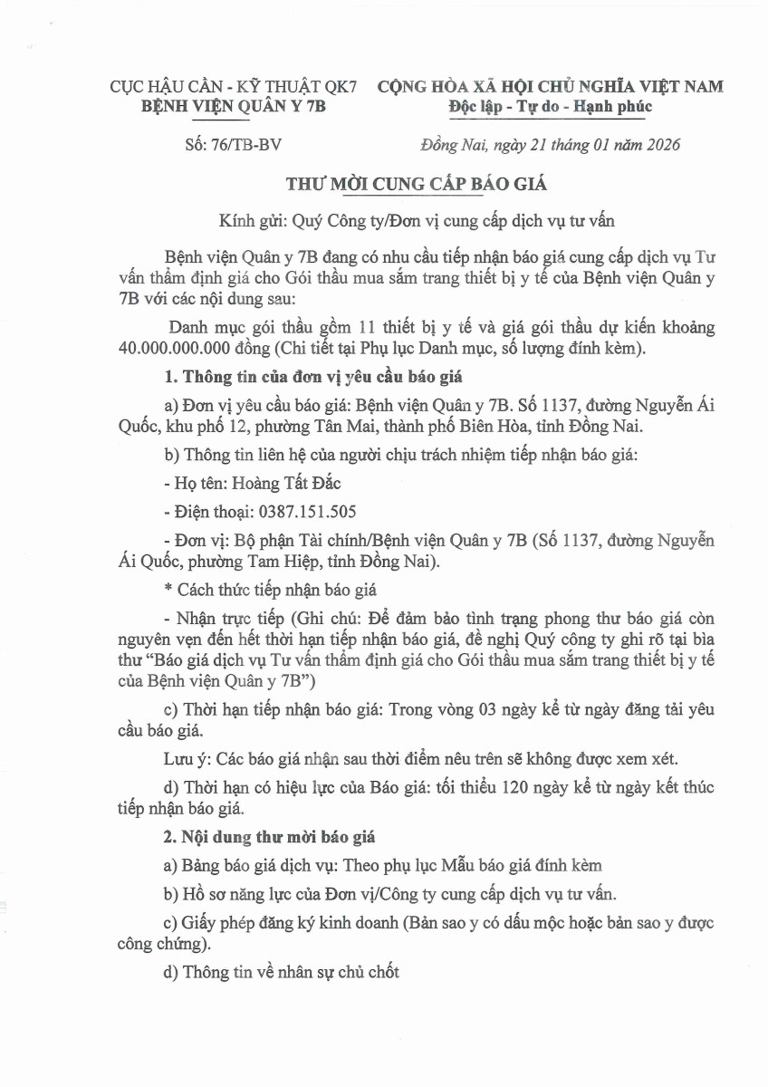 BỆNH VIỆN QUÂN Y 7B BIÊN HÒA ĐỒNG NAI - CỤC HẬU CẦN - KỸ THUẬT QUÂN KHU 7